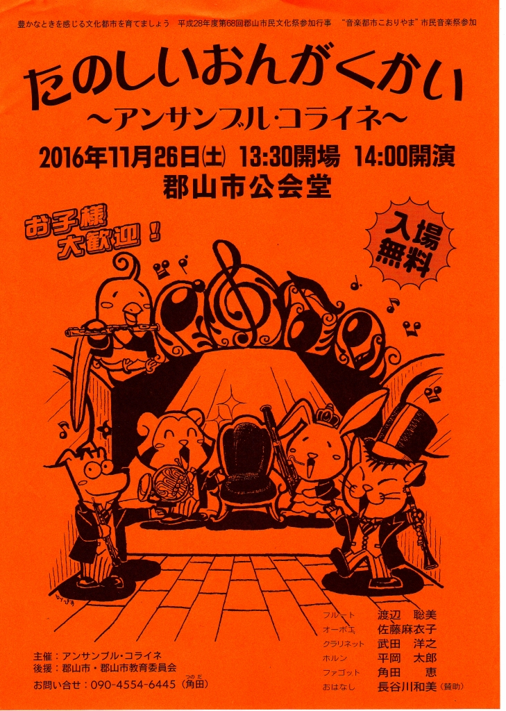 11月26日(土)郡山市公会堂にて、アンサンブル・コライネがお送りする”たのしいおんがくかい”が開催されます。