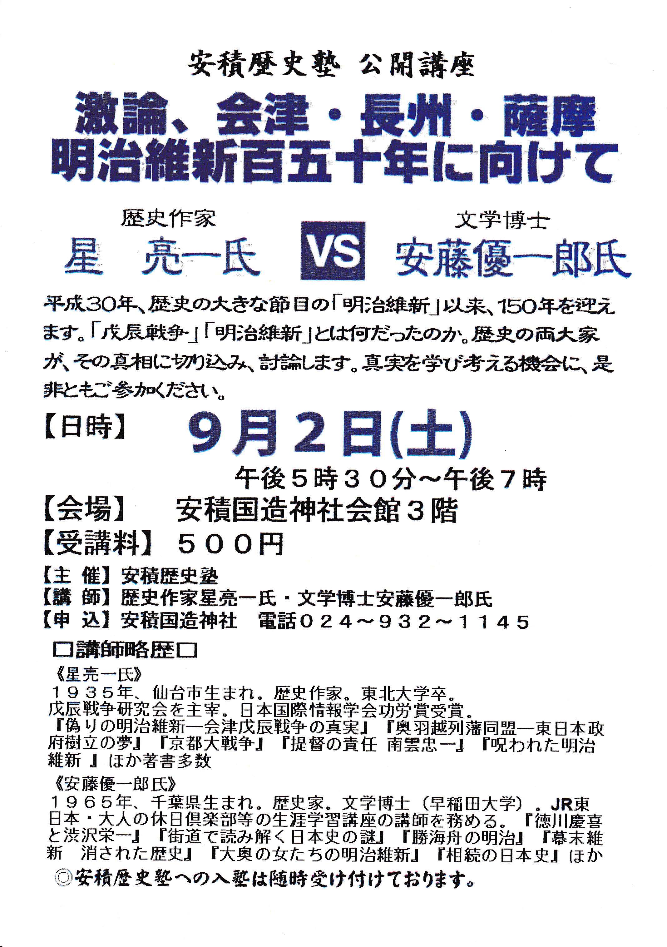 『激論、会津・長州・薩摩―明治維新150年に向けて』の演題で、歴史作家の星亮一氏と文学博士の安藤雄一郎氏のお二人が討論を行います。