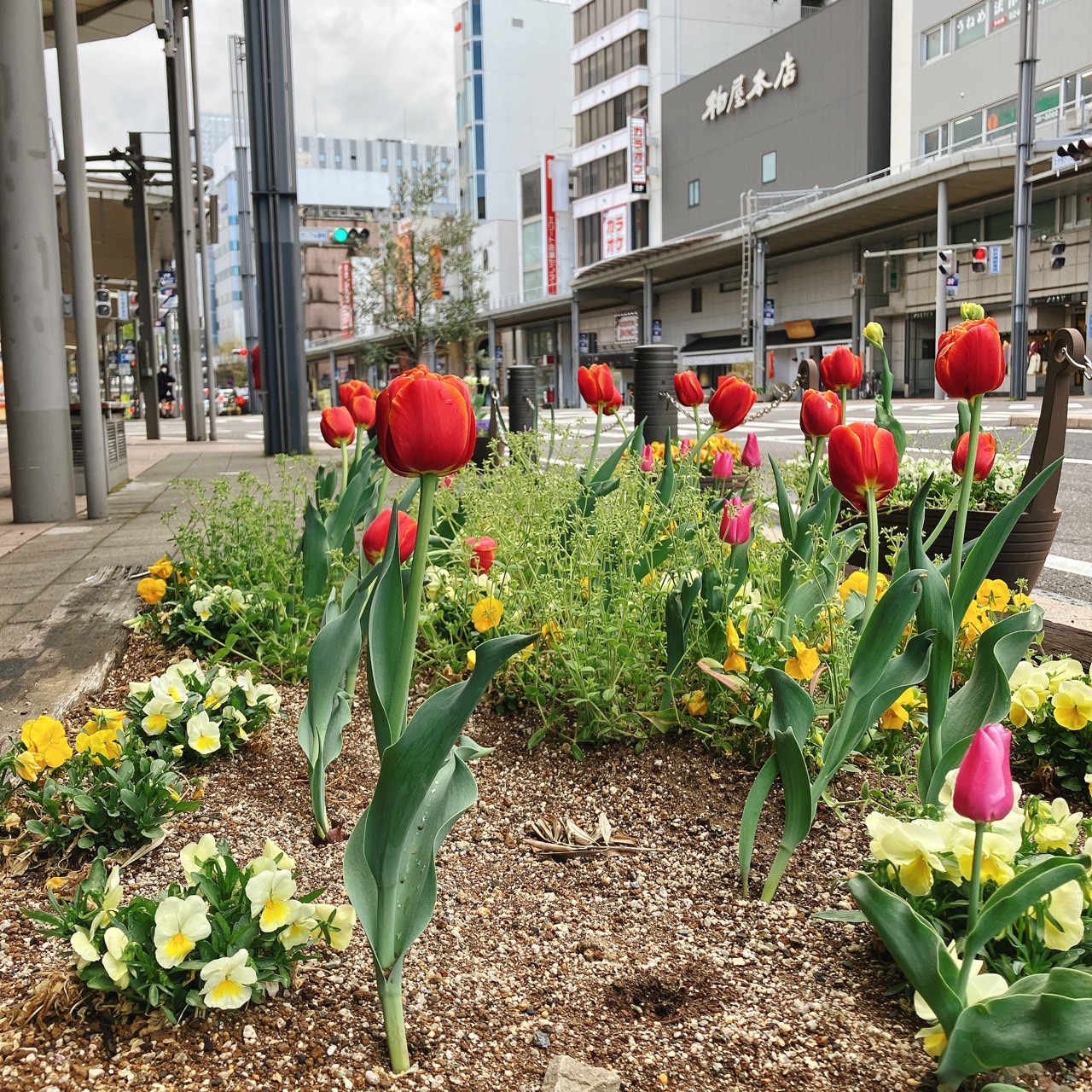 枝だけだった街路樹も新芽がでてきましたね。 チューリップも首をのびのびと伸ばしてきもちよさそうです。
