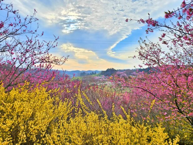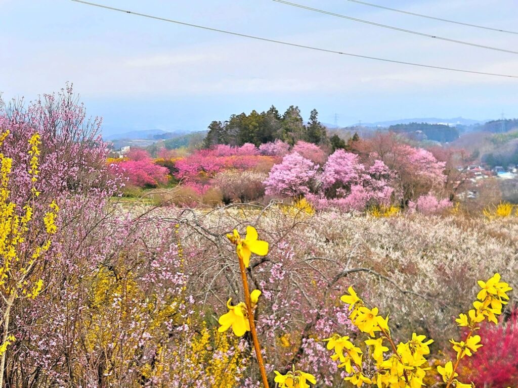 郡山市西田町の梅の里。3月には、白、赤の梅が一面に咲く場所です。梅の花の後には、黄色のレンギョウ、ピンクの桜も咲き、4月の花も楽しむことができます。