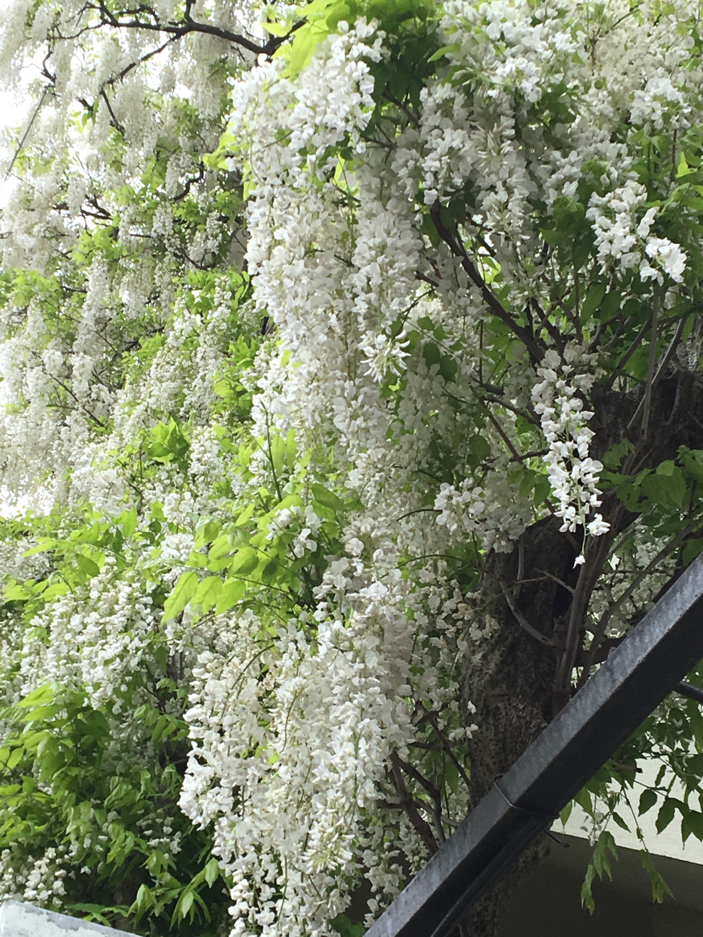 郡山市細沼町の中央質店さんの藤が、見事に咲きました。満開です。白い花が連なり、とても美しいです。 ※中央…